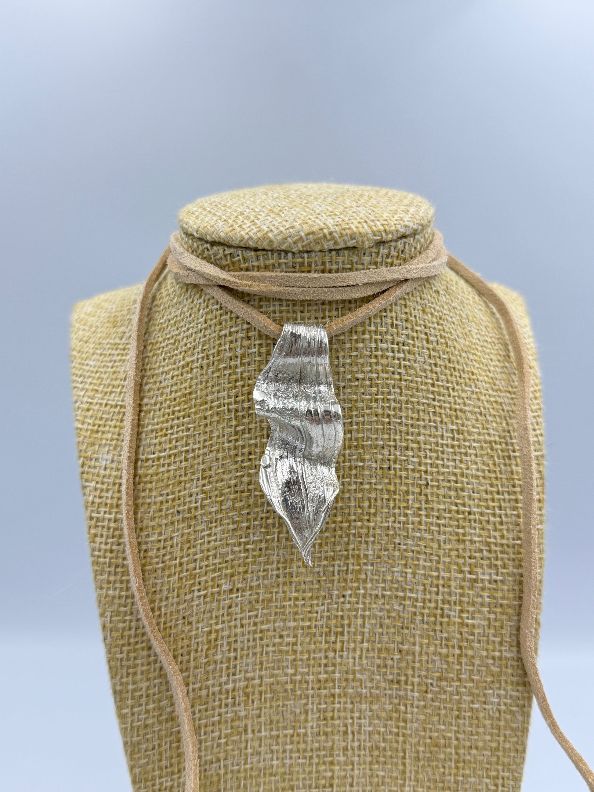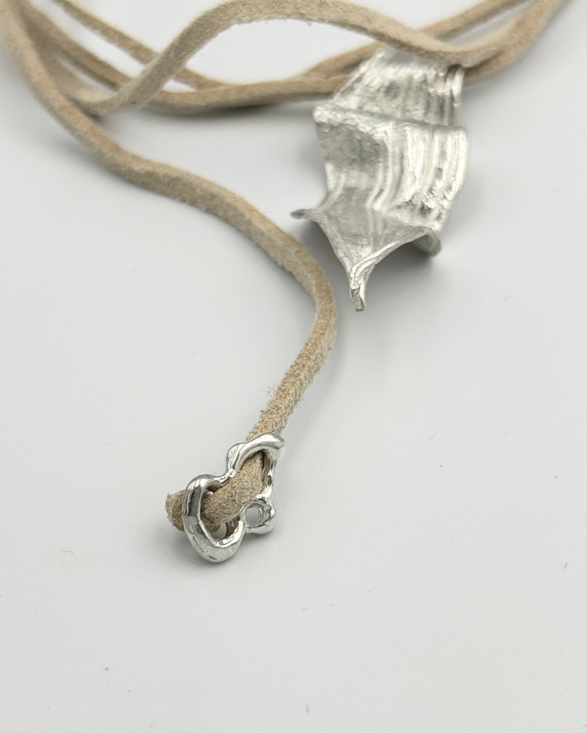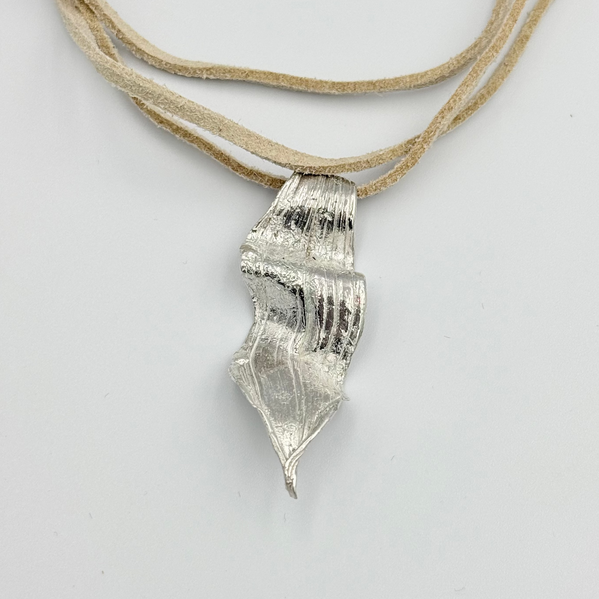 Collana con cordino in camoscio beige realizzato con l'antica tecnica Giapponese del Mitsuro Hikime.